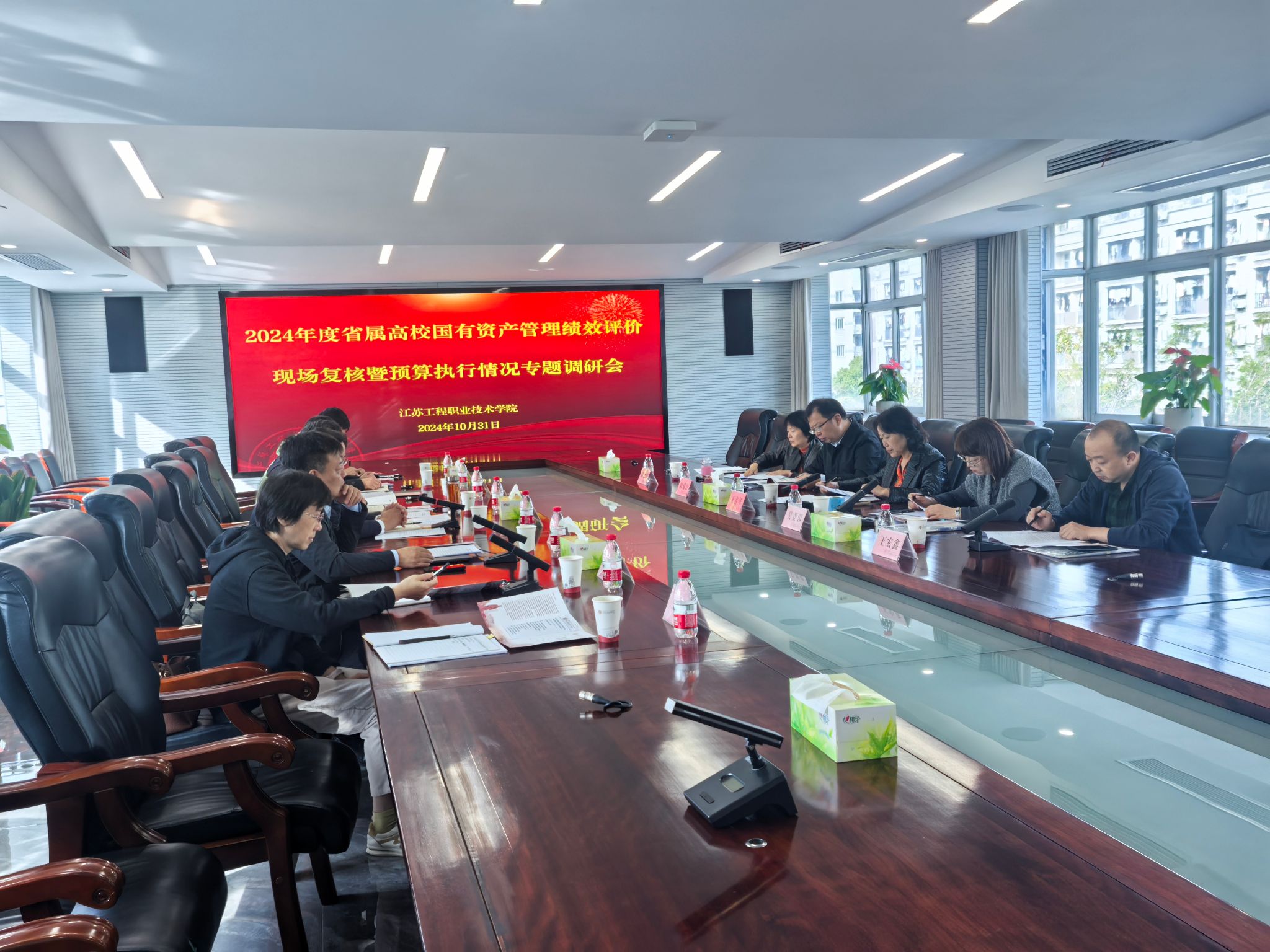 张忠致欢迎辞,代表学校对工作组专家的到来表示热烈欢迎,对各位专家长期以来对我校国有资产和财务管理工作的支持表示衷心感谢。郭江峰全面汇报了我校2023年度国有资产管理绩效评价工作和2024年度预算执行情况。